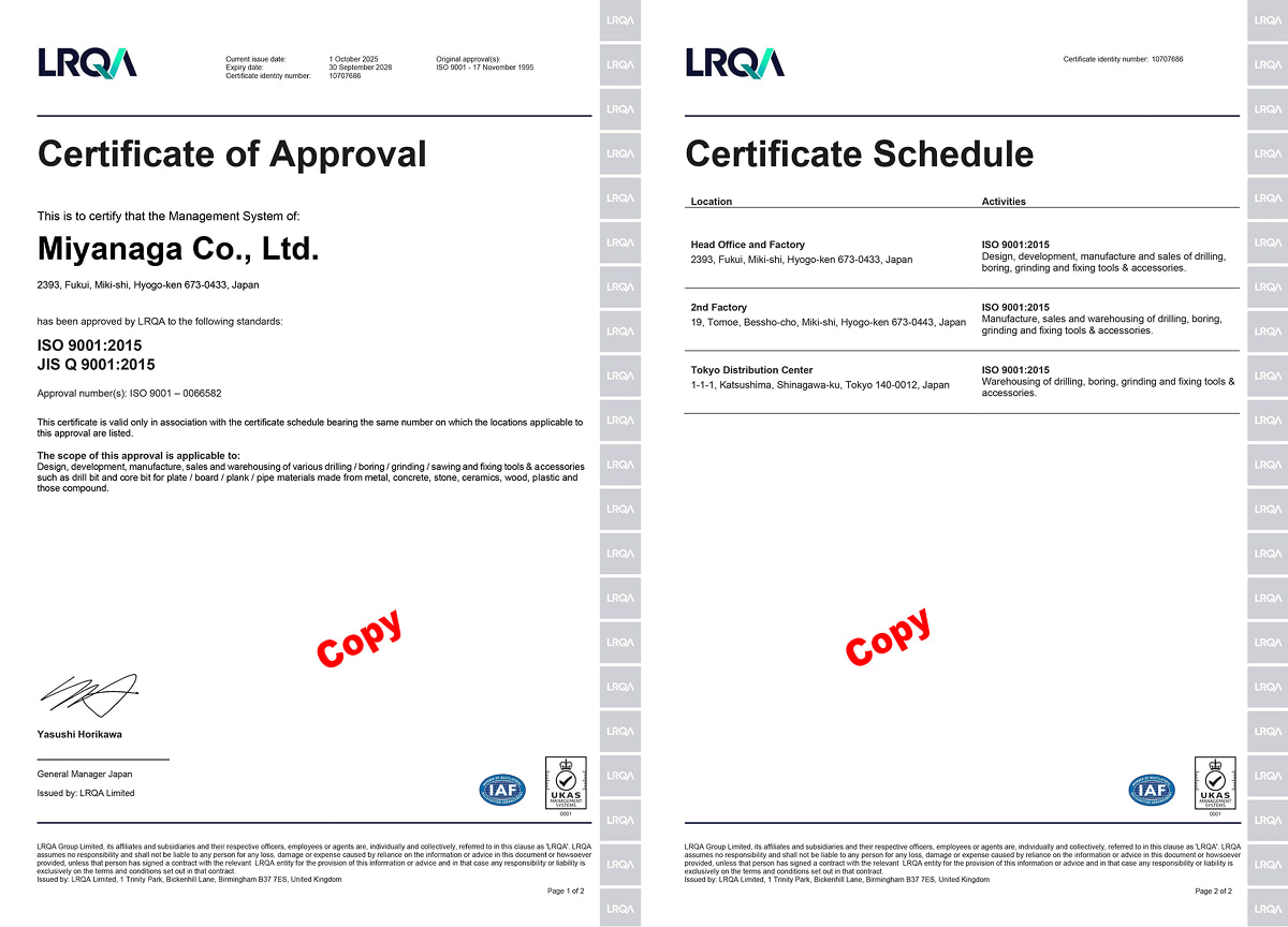 - 株式会社ミヤナガは、ISO 9001 品質マネジメントシステムを経営ツールの一部として利用し、日々改善を行い、顧客満足の向上に努める。